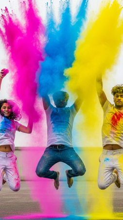 Three diverse friends leap mid-air, releasing massive pink, blue, and yellow powdered paint clouds during a dynamic Holi celebration. High-speed action.