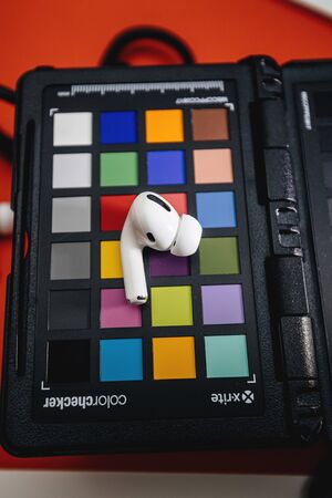 Paris, France - Oct 30, 2019: New Apple Computers AirPods Pro headphones with Active Noise Cancellation for immersive sound on Pantone X-Rite color checker chart