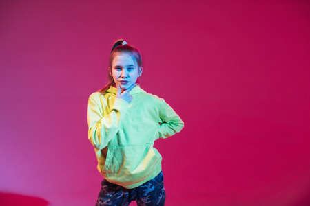 Teen in the studio indoors with neon light. Portrait of beautiful young girl.