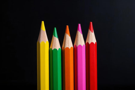 Top close up shot of colored pencils arranged in decreasing order of heights shot over black background with copy space on the right