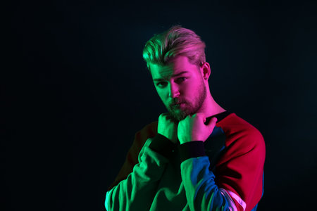 Toned portrait of handsome young man on dark background