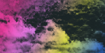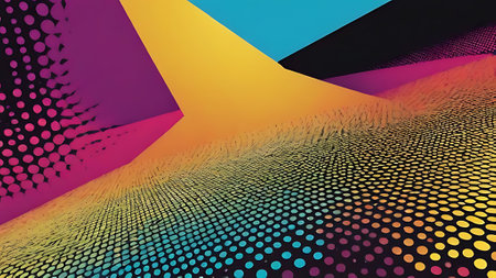 Vibrant abstract design with dark background and halftone effects showcasing a blend of vivid colors and clean shadows