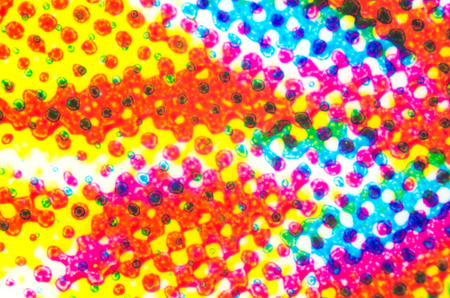 Four color printing on a plastic surface under the microscope. CMYK Cyan Magenta Yellow and Key or black color process. Subtractive color mixing. Synthesis with primary and secondary colors. Photo.