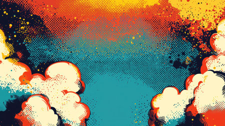 Vibrant comic style clouds in bold reds and yellows against a turquoise sky, capturing a dramatic and dynamic atmosphere in the artwork
