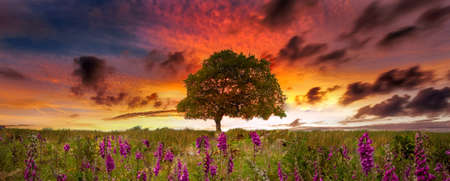 Foxgloves and a solo tree at sunset on the Brecon Beacons in South Wales UK