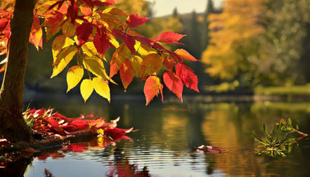 Vibrant autumn leaves creating a colorful tapestry on a reflective surface