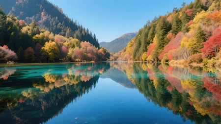 This stunning image captures the vibrant colors of autumn foliage reflecting in a serene lake under a bright blue sky, creating a picturesque landscape.