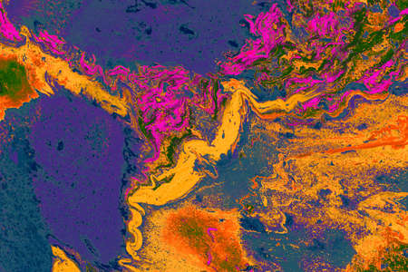 Spill texture. Ink ripple flow. Blur purple yellow blue color water golden mix fluid emulsion floating on abstract creative background.
