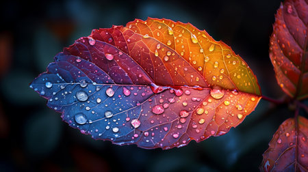 A single leaf is the primary subject, displaying a spectrum of colors including pink, purple, and green hues. Tiny water droplets glisten on its textured surface, which is set against a dark, contrasting backdrop. The image utilizes macro photography techniques, and it could be suitable for various design, editorial, or commercial applications.