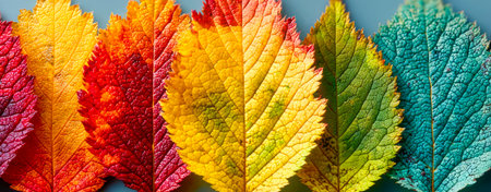 Autumn Banner With autumn leaves in gradient from deep red to turquoise on neutral background. Concept of seasonal change, nature s palette, botanical textures, and vibrant fall design inspiration