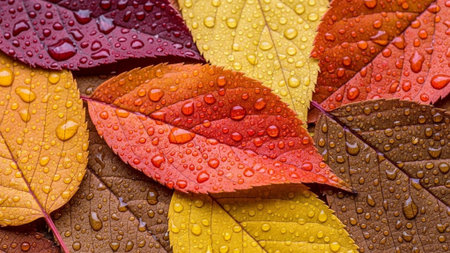 Close-up shot of a vibrant maple leaf glistening with morning dew. Rich autumn colors and intricate details are beautifully captured