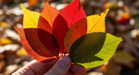 A stunning arrangement of colorful leaves in a rainbow pattern, showcasing the beauty of nature.