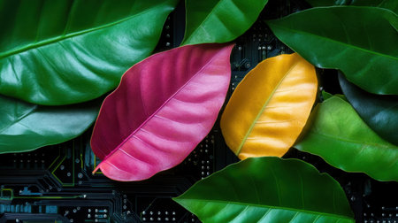 Nature meets technology: vivid leaves contrasting with dark digital circuit patterns
