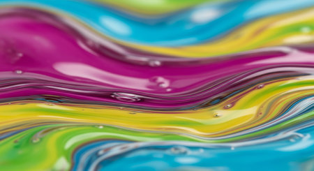 Macro view of swirling liquid paint in vibrant magenta yellow green and blue with small air bubbles and a glossy, fluid texture.