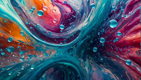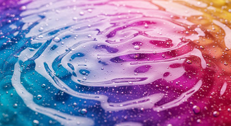 Macro view of swirling liquid with vibrant rainbow colors and small bubbles. Clear details and vibrant colors ...