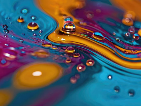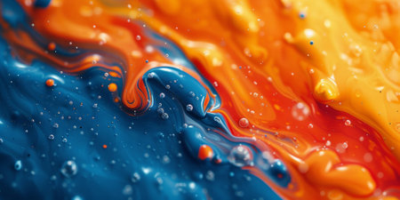 Droplets showing abstract macro shot of colorful liquid paint mixing with small bubbles and droplets in vibrant blue orange and green.