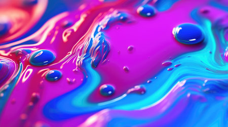 The close up of a glossy liquid surface abstract in hot pink, electric blue, and neon green colors with a soft focus. 3D illustration of exuberant.