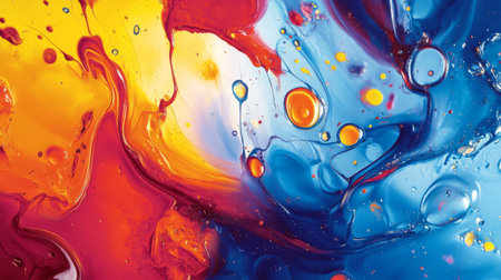 A stunning abstract representation of colorful liquid splashes, showcasing vibrant blue, pink, yellow hues blending fluidly, ideal for art and design projects.