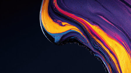 An abstract composition features a dynamic swirl of colorful paint. Yellow, purple, and red hues blend and flow across a dark background, creating a textured visual effect. This image's composition and color palette offer potential use in creative projects and design applications. Its vibrant appearance makes it suitable for various commercial or editorial uses.