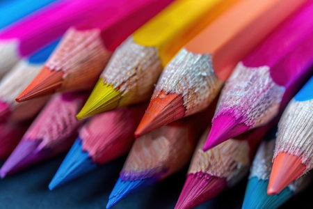 A stunning display of vibrant colored pencils lined up perfectly. Each pencil tip showcases a different bright color, reflecting beautifully on a smooth surface, inspiring creativity and artistic