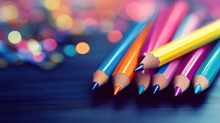 A visually striking arrangement of colorful pencils on a dark surface, enhanced by a vibrant bokeh background that adds depth and creativity.