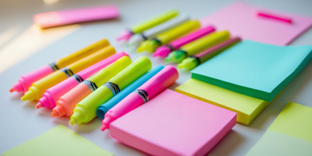 Colorful stationery supplies arranged neatly on a workspace during daylight hours