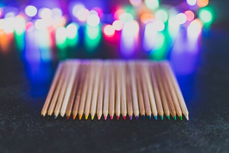 creativity and fun concept, assortment of coloured pencils on dark background with psychedelic multicolor string lights creating rainbow bokeh behind them