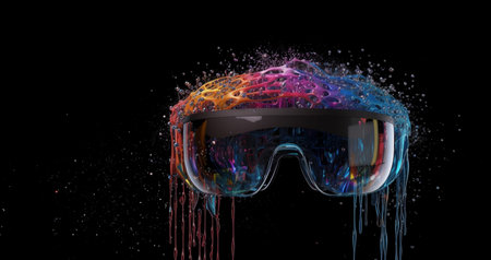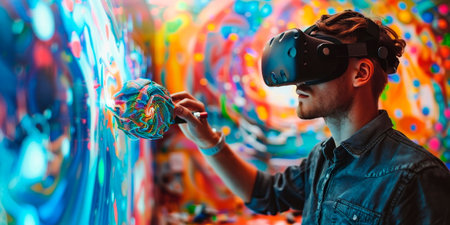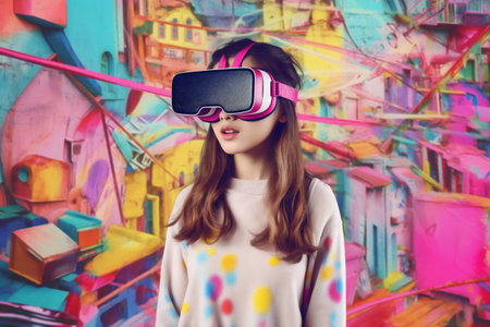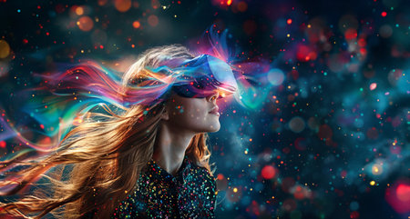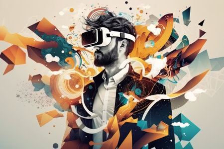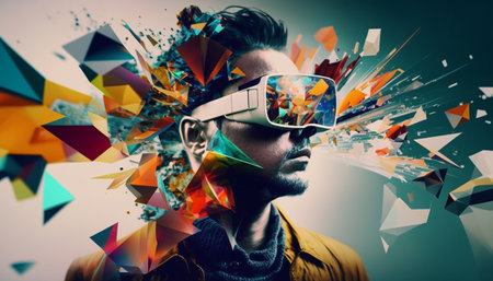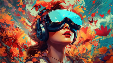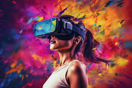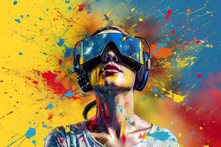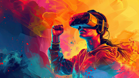 Vibrant Artistic Digital Experience with VR Headset in Colorful Abstract Background