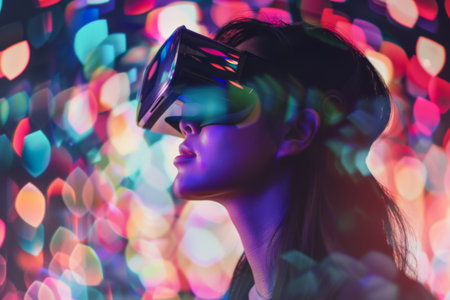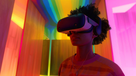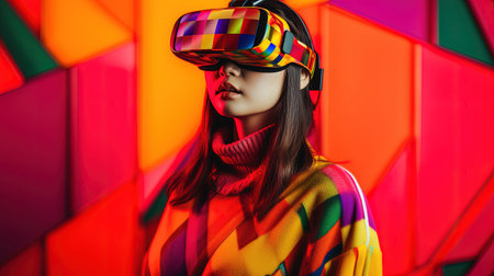 Woman Experiencing Virtual Reality in a Colorful Space