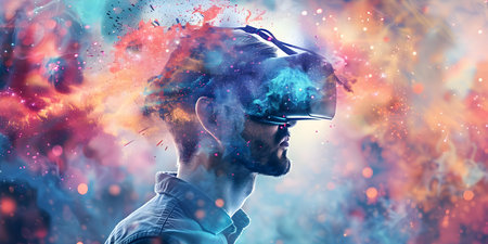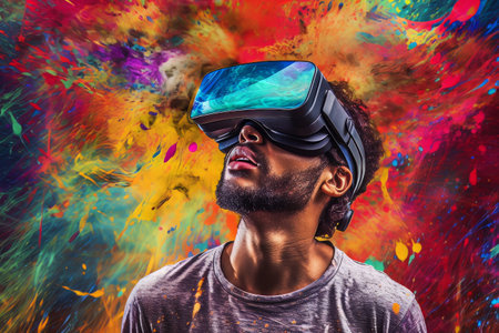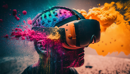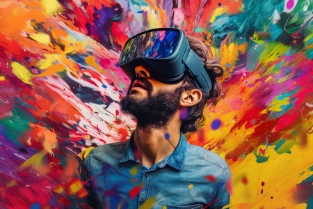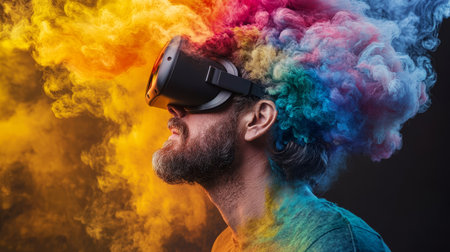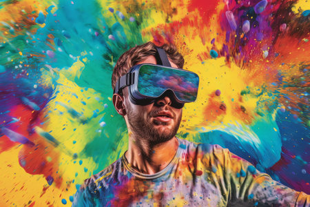 Immersed in Color Man in VR Headset Explores Virtual Reality, Vibrant Colors, Creative Explosion