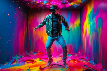 A young man is wearing virtual reality glasses and dancing amidst colorful splashes of paint.