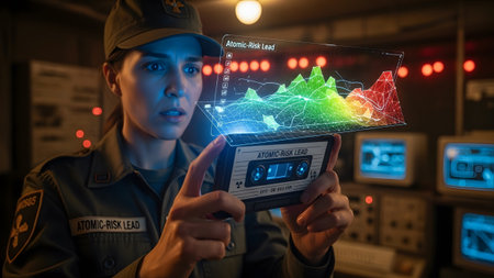A woman in a military uniform holds a cassette tape projecting a colorful holographic data chart...