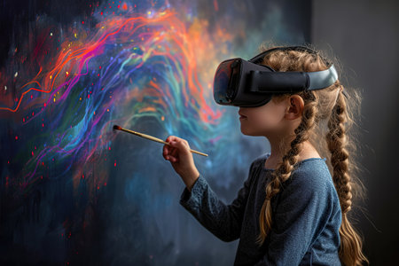A child artist paints while wearing a virtual reality headset, showing Infographic of imagination.