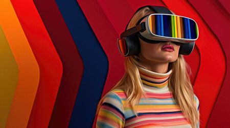 Young female model wearing VR posing with trendy fashion outfit and colorful red optical art abstract background. Picturesque generative AI