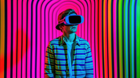 A person experiences virtual reality with vibrant colors and dynamic lights in a modern setting.