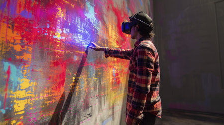 Skilled creative artist using VR glasses painting futuristic digital art at wall. Professional graphic designer making street art by using visual reality goggle with vibrant colorful color. AIG42.