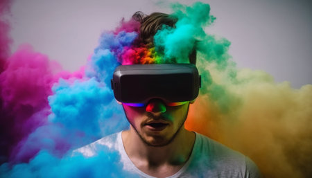 young man in VR glasses, colorful smoke, generative ai