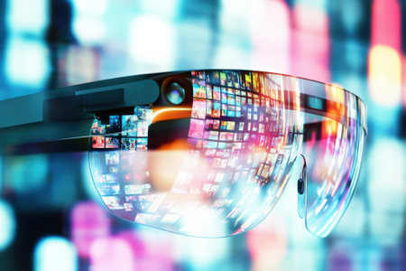 Smart glasses display vibrant digital screens, highlighting technology's role in urban life and innovation.
