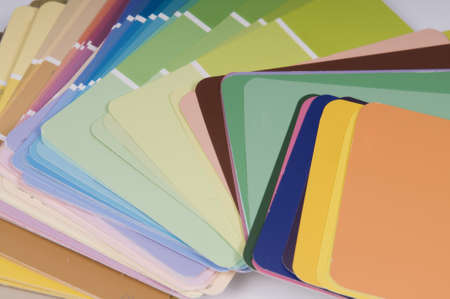 Banner of a color guide displaying a range of hues for use in interior design and decoration. Colorful color guide with a palette of paint samples on white background with copy space.