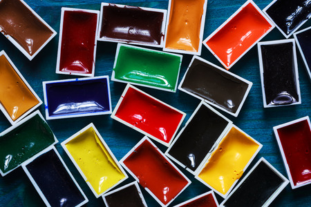 On a dark gray wooden tabletop, juicy watercolor paints, which the artist already used, are open.