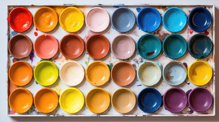 Colorful Watercolor Paint Palette Close-up - Artist Gouache Colors and Creative Art Supplies in Action.