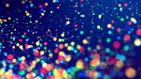 cloud of multicolored particles fly in air slowly or float in liquid like sparkles on dark blue background. Beautiful bokeh light effects with glowing particles for holiday presentations