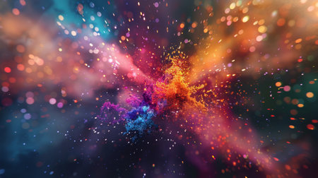 Vibrant explosion of multicolored powder against a black background, creating a dramatic burst of energy