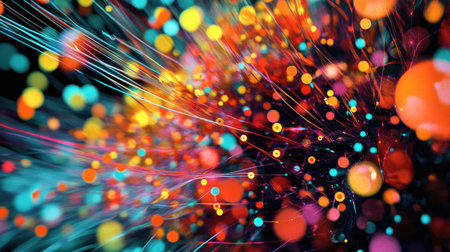 3d abstract beautiful background with colorful glowing particles, depth of field and bokeh effect. Abstract explosion of multicolored shiny particles or light rays like laser show.
