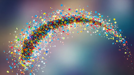A dynamic explosion of colorful confetti and glitter particles forms a vibrant arc against a softly blurred gradient background with scattered bokeh lights.