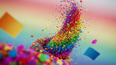 A dynamic explosion of rainbow colored confetti and small geometric shapes against a soft, blurred gradient background.