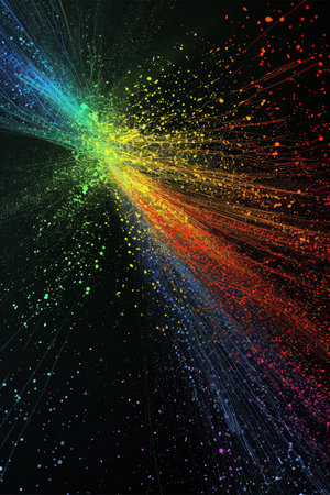 An abstract depicting a dynamic explosion of colorful particles. The particles radiate outwards from a central point, creating a vibrant rainbow spectrum. Shades of red, orange, yellow, green, blue, and purple blend and shimmer, forming a luminous and energetic burst. The bokeh effect adds a sense of depth and magic to this visually striking composition.