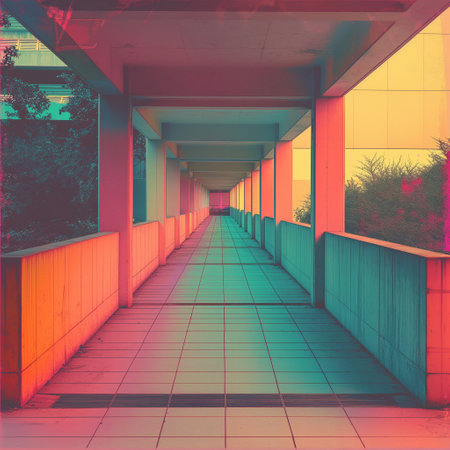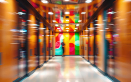 Vibrant corridor with colorful walls and reflections in a modern building during daytime
