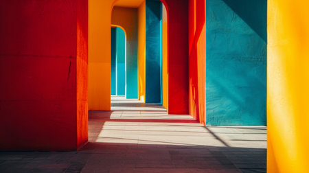 Brightly colored architectural columns casting shadows, creating a vibrant and geometric scene with strong contrasts and bold lines.