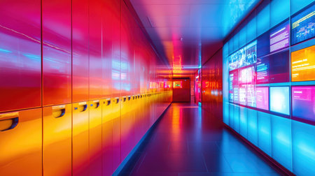 This image showcases a vibrant corridor featuring sleek cabinets and colorful illuminated panels, creating a striking contemporary environment perfect for modern spaces.